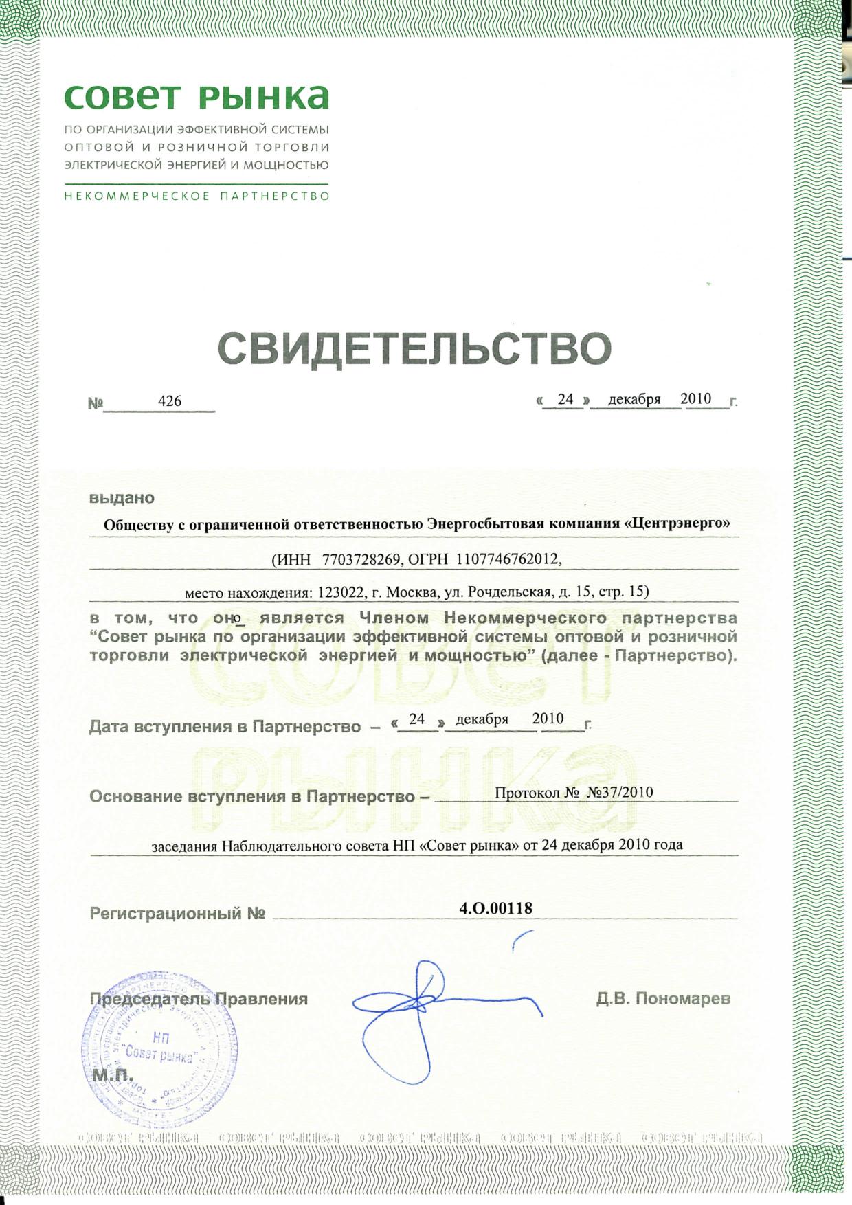 Свидетельство о членстве в НП Совет Рынка